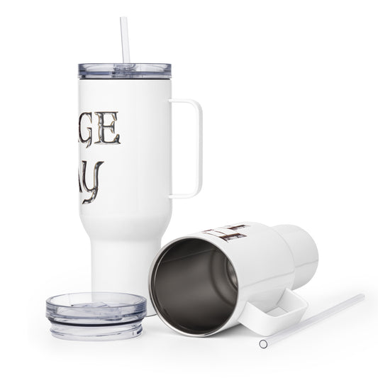 40 oz. White Travel Cup with a Handle Forge & Fray logo